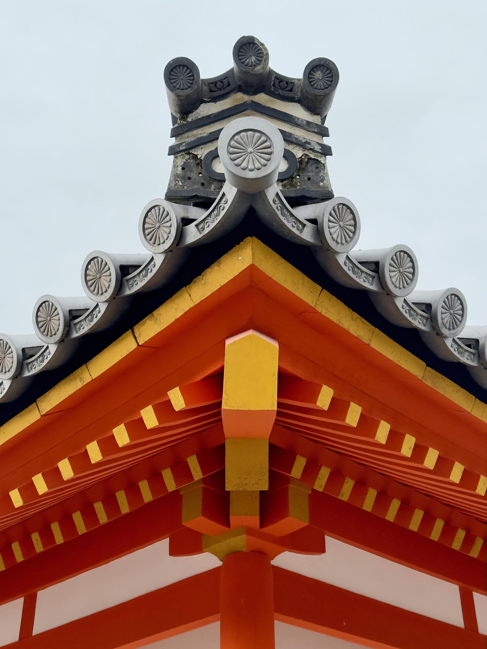 This photo is a corner of the older part of the Imperial Palace in Kyōto. I’m impressed with the intricacy of the construction: the number and precision placement of the support beams, and the all of the artful details in the eaves and roof tiles.