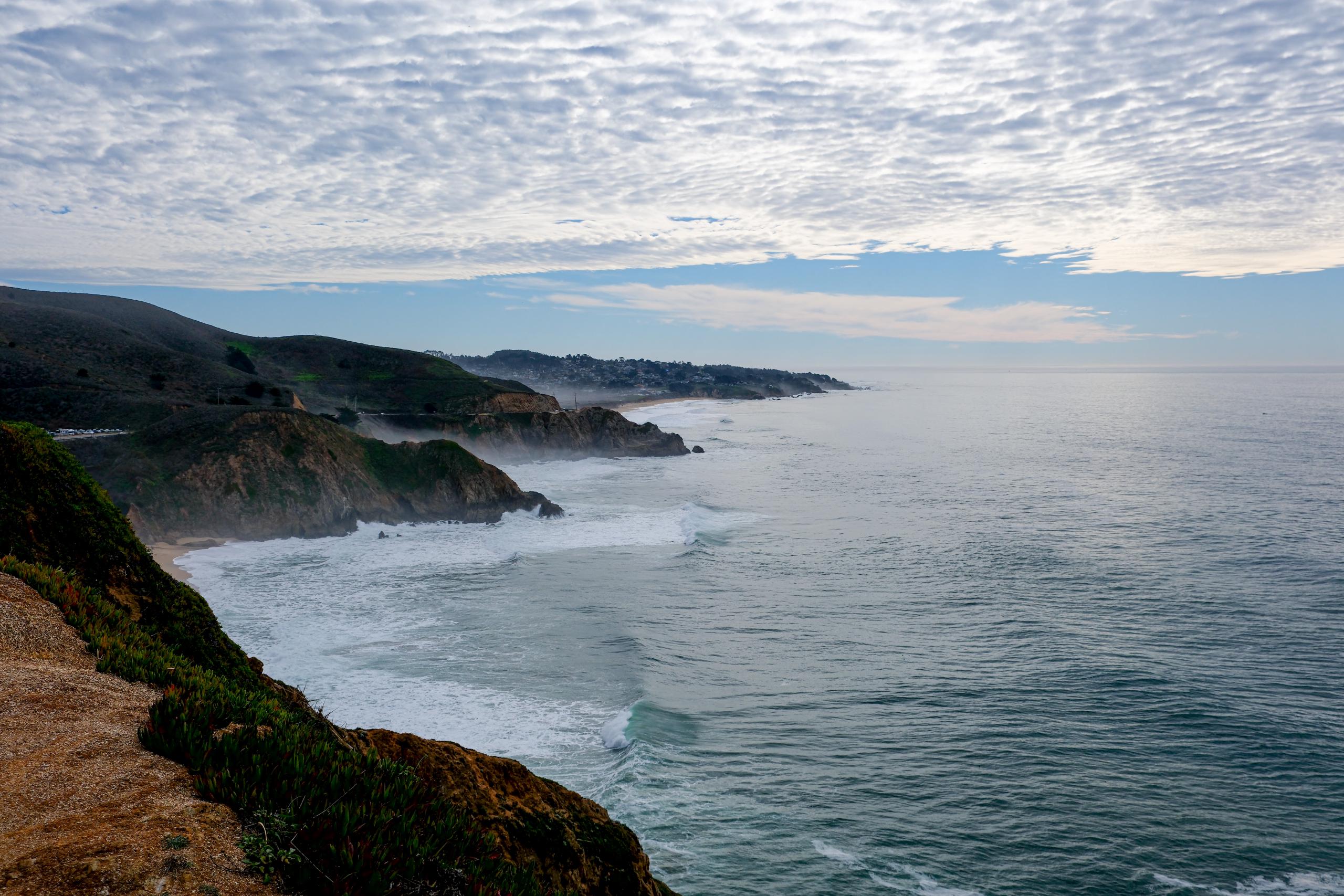 Earlier this year, Tess and I went on a short hike in the Devil’s Slide area, along Highway 1. This photo is looking south along the coast. I love the fog tucked into the coves. I took another photo facing north too.