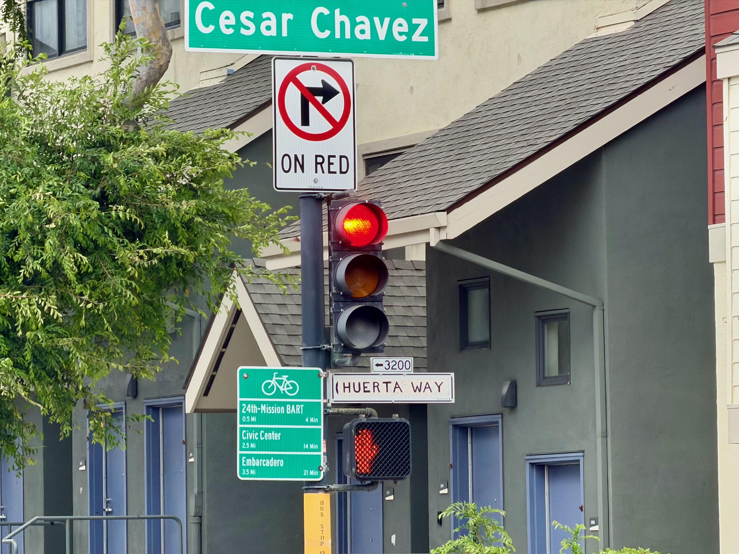 Someone taped over the street sign at Cesar Chavez and Folsom in San Francisco, relabeling the street Huerta Way, in honor of Dolores Huerta.